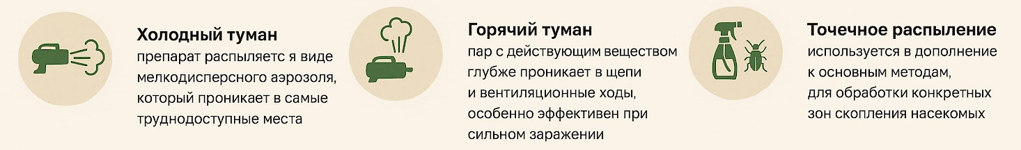 - генераторы холодного и горячего тумана, которые превращают препарат в мельчайший аэрозоль, заполняющий все щели и труднодоступные зоны;